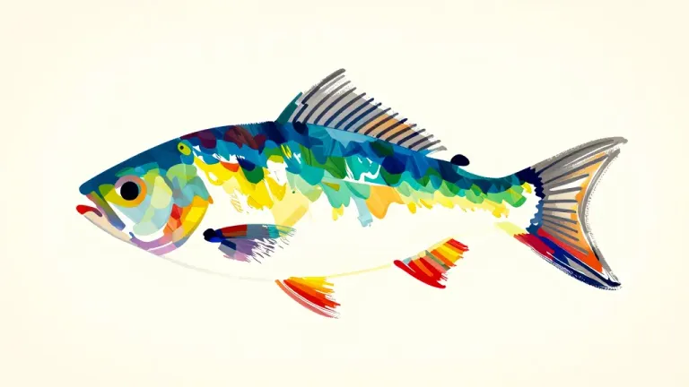 A vibrant fish silhouette rendered with paint splatters, illuminated by side lighting that creates subtle shadows and depth, set against a neutral, light beige background that emphasizes the fish's form and color palette.