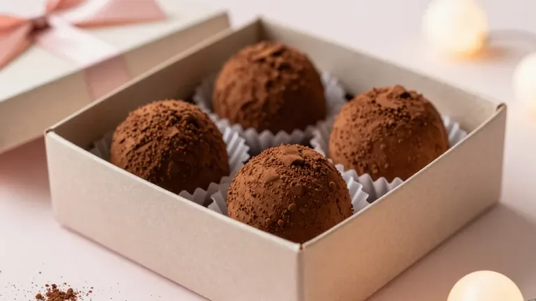 A close-up of a box of chocolate truffles with a fine cocoa powder coating, softly lit from above, creating gentle highlights and shadows. The clean white background and blurred truffles in the foreground create a sense of depth and focus on the subject.