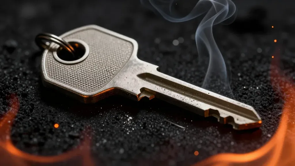 A close-up of a charred motorcycle key smoldering amidst embers, with warm, flickering light highlighting its rough, smoky texture. The shallow depth of field isolates the key against a dark, smoky background, emphasizing its dramatic state.