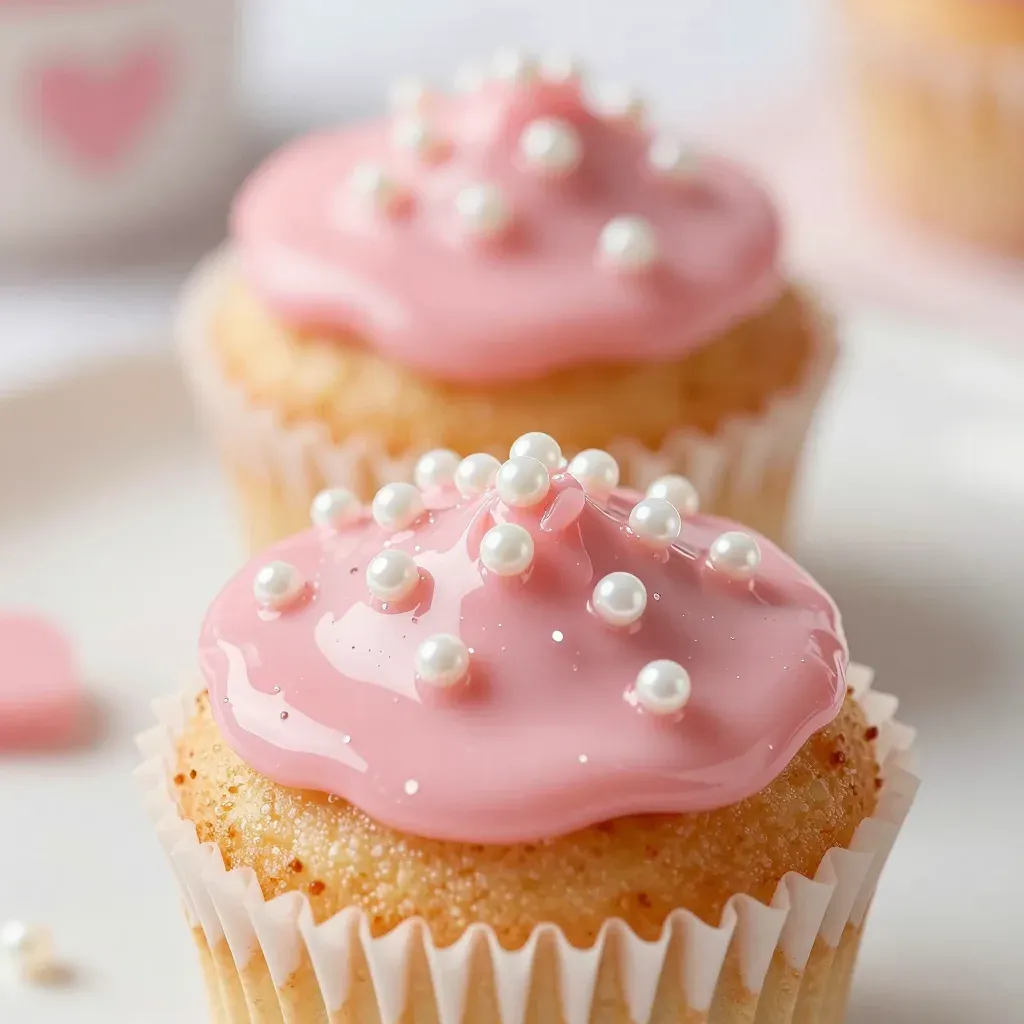 Two golden cupcakes with glossy pink glaze and white pearls, softly lit to highlight texture, set against a blurred, light-colored background with hints of pink and white, creating a warm, elegant aesthetic.