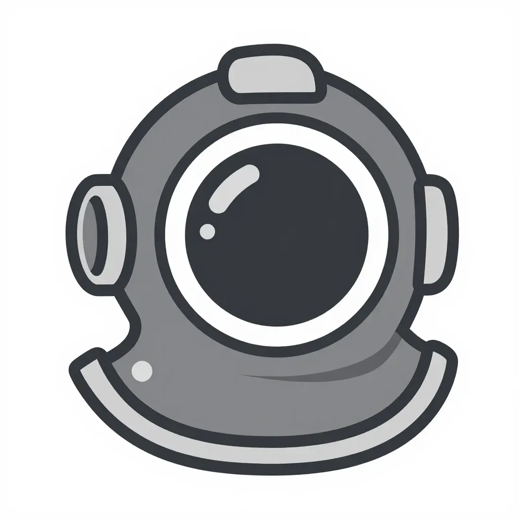 A monochromatic metallic diver's helmet with a reflective visor, softly lit to highlight its contours and texture, set against a neutral, blurred background to emphasize the helmet as the focal point.