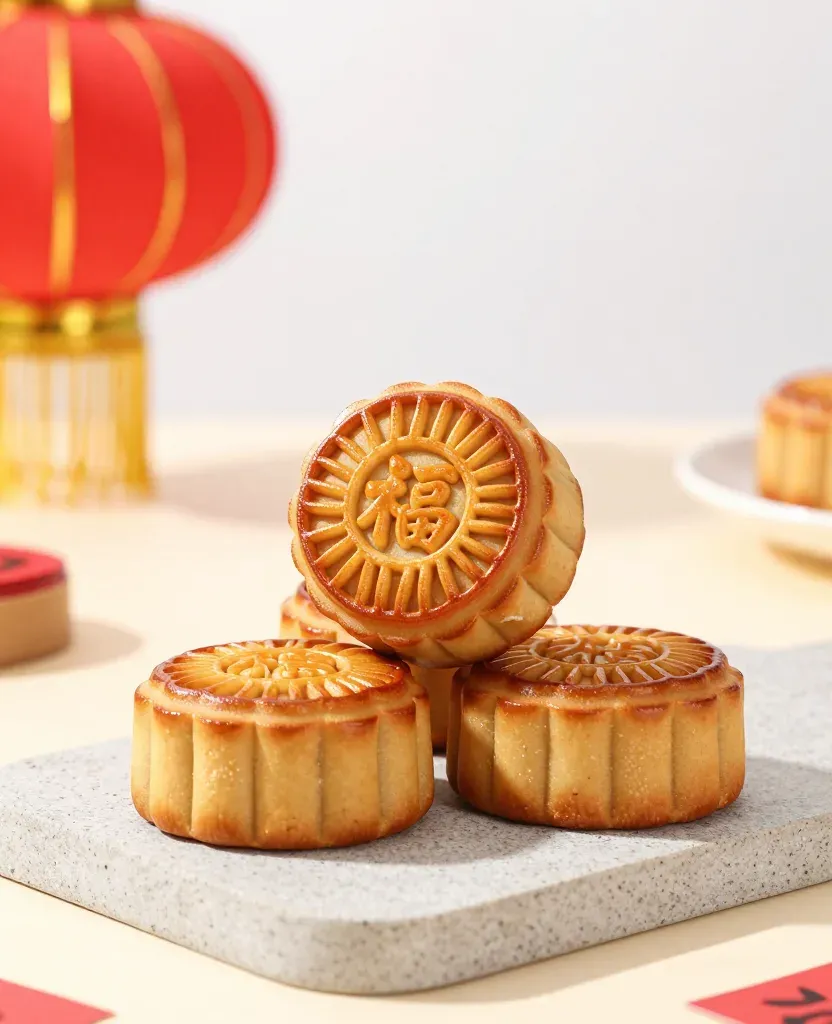 A beautifully arranged stack of glossy, golden-brown mooncakes with intricate textures, illuminated by soft, diffused light that enhances their inviting appearance. The shallow depth of field and warm color palette create a festive and elegant setting.
