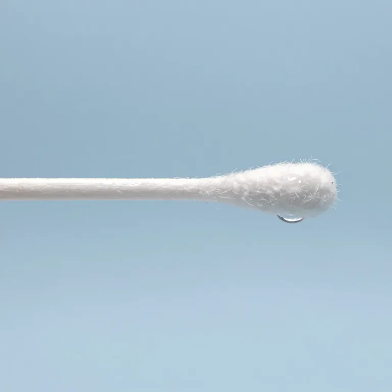 A close-up of a cotton swab tip with a glossy water bead, illuminated by soft, diffused light that highlights the texture of the cotton and the clarity of the bead. The shallow depth of field and uniform blue background emphasize the subject, providing ample copy space for design integration.