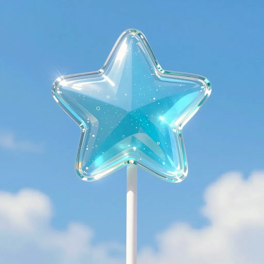 A star-shaped lollipop with a translucent, crystal-like texture, glistening under direct sunlight, set against a clear blue sky with soft clouds. The composition centers the lollipop, creating a balanced and visually appealing frame.