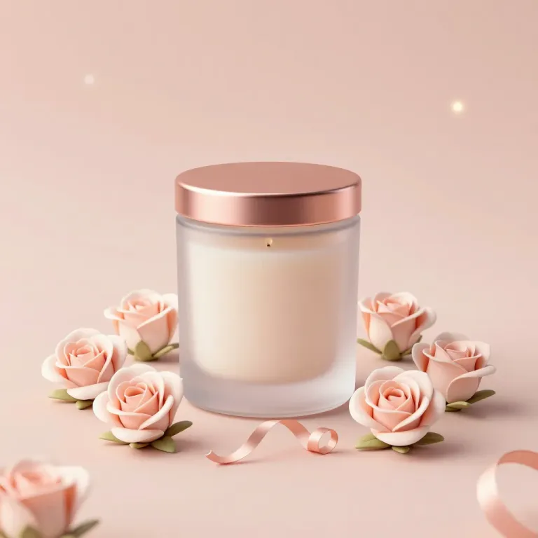 A frosted glass jar with a rose-gold lid is centered, surrounded by delicate roses and a ribbon, bathed in soft, diffused light that creates gentle highlights and a warm, ambient glow. The blurred, pastel pink background with subtle bokeh effects enhances the focus on the jar and roses, offering ample copy space.