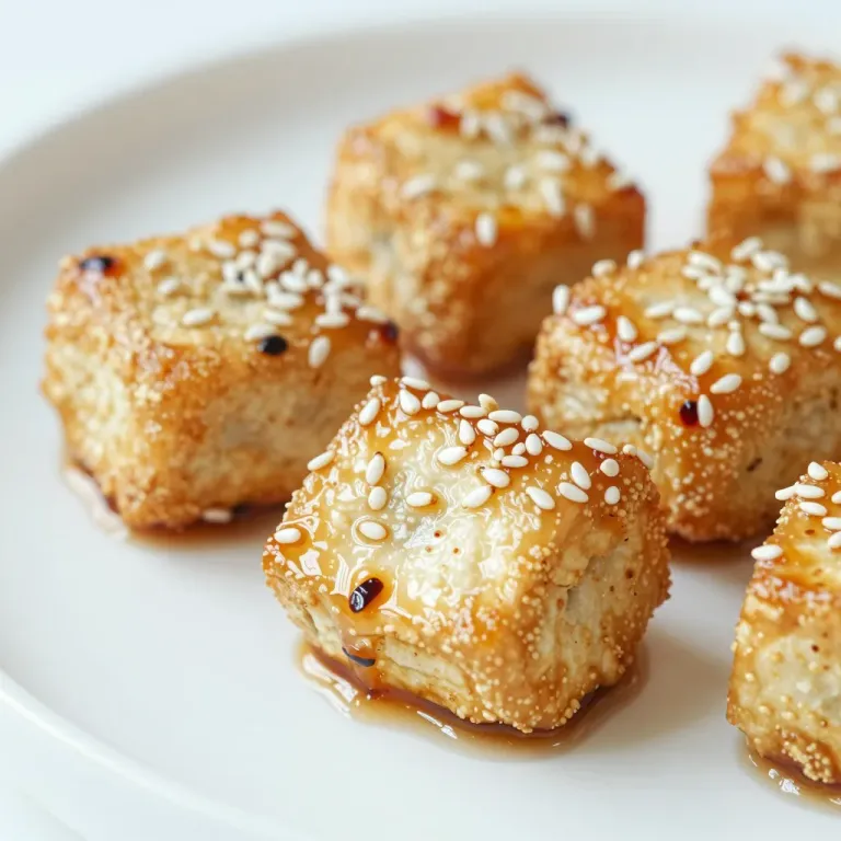 Golden-brown cubed tofu pieces topped with sesame seeds and a glossy amber glaze, showcasing a crispy exterior and soft interior. Soft diffused lighting highlights the texture with shallow depth of field and a clean white plate background.