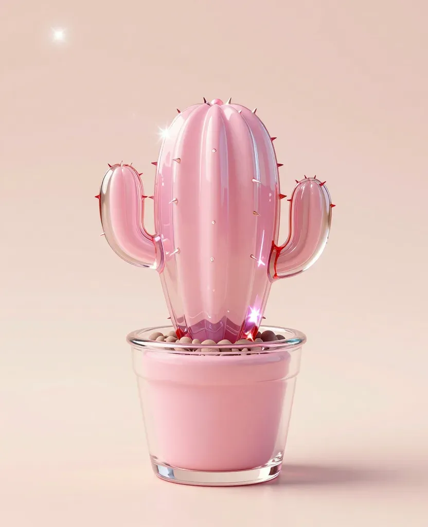 A crystal-clear pink cactus with iridescent spines stands in a glass pot, illuminated by soft, diffused light that highlights its glossy texture and creates a gentle glow. The pale pink, blurred background provides a clean and unobtrusive backdrop, emphasizing the cactus as the focal point.