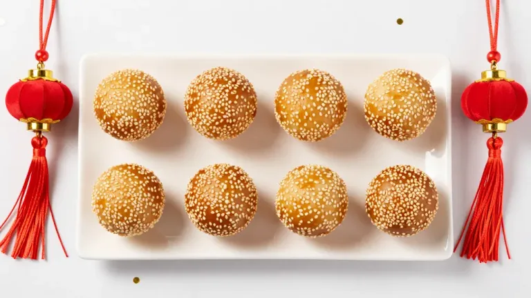 Golden-brown sesame balls with white sesame seeds are arranged neatly on a white plate, creating a symmetrical and festive display. The warm, directional lighting highlights the glossy texture and nutty appearance of the sesame balls, while the red tassels add a vibrant contrast against the clean white background.