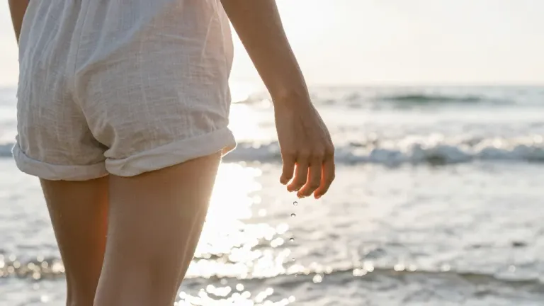 A person in white linen shorts walks along the beach at sunset, with golden sunlight reflecting off the water and wet sand. The blurred waves and horizon create a sense of depth and vastness.