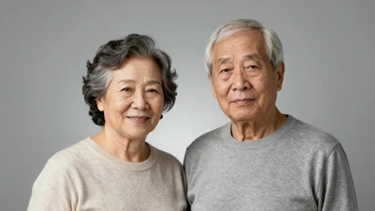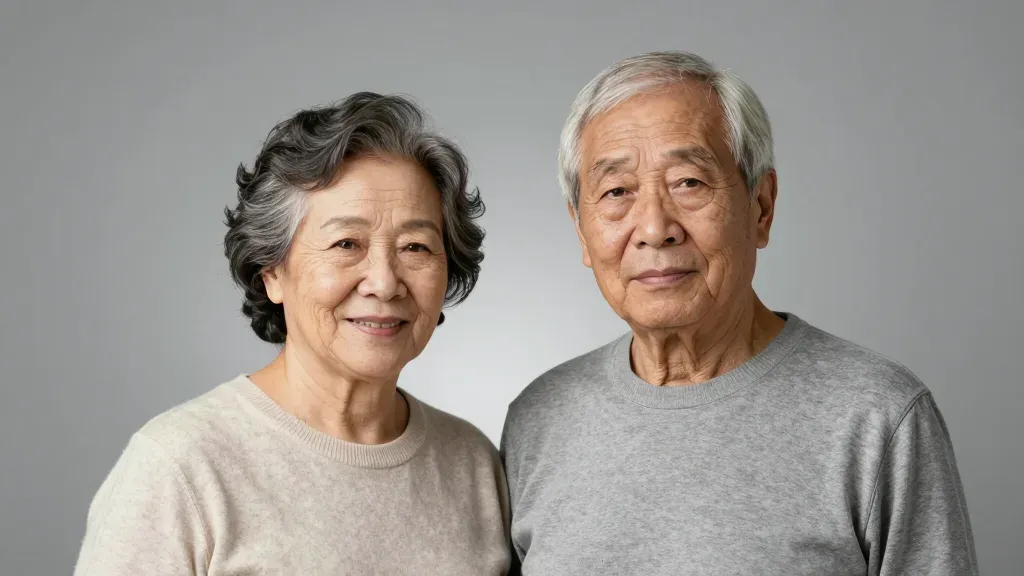An elderly couple embraces warmly in soft gray sweaters, their faces illuminated by diffused, even light that highlights their gentle expressions and subtle skin textures. The neutral gray background ensures the subjects remain the focal point, creating an intimate and personal portrait.