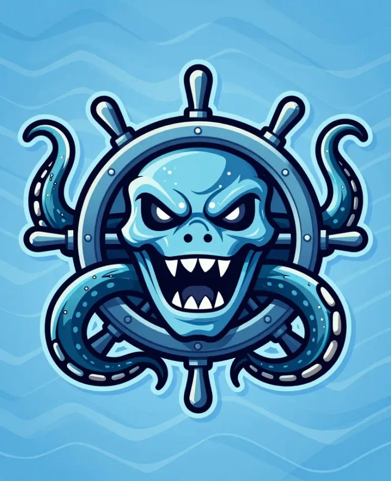 A menacing kraken with icy blue skin and sharp teeth, gripping a metallic ship's helm, set against a soft, blurred blue sea background. The cold, bluish light highlights the kraken's features, creating a dramatic and eerie atmosphere.