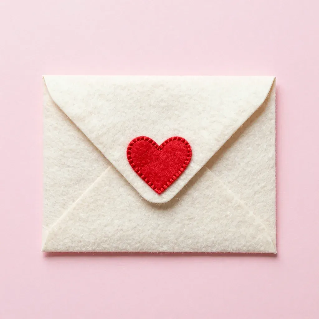 A white felt envelope adorned with a red heart, softly lit with diffused light, creating gentle shadows and emphasizing the texture and color contrast against a solid pink background. The shallow depth of field draws attention to the envelope, making it ideal for design elements or romantic themes.