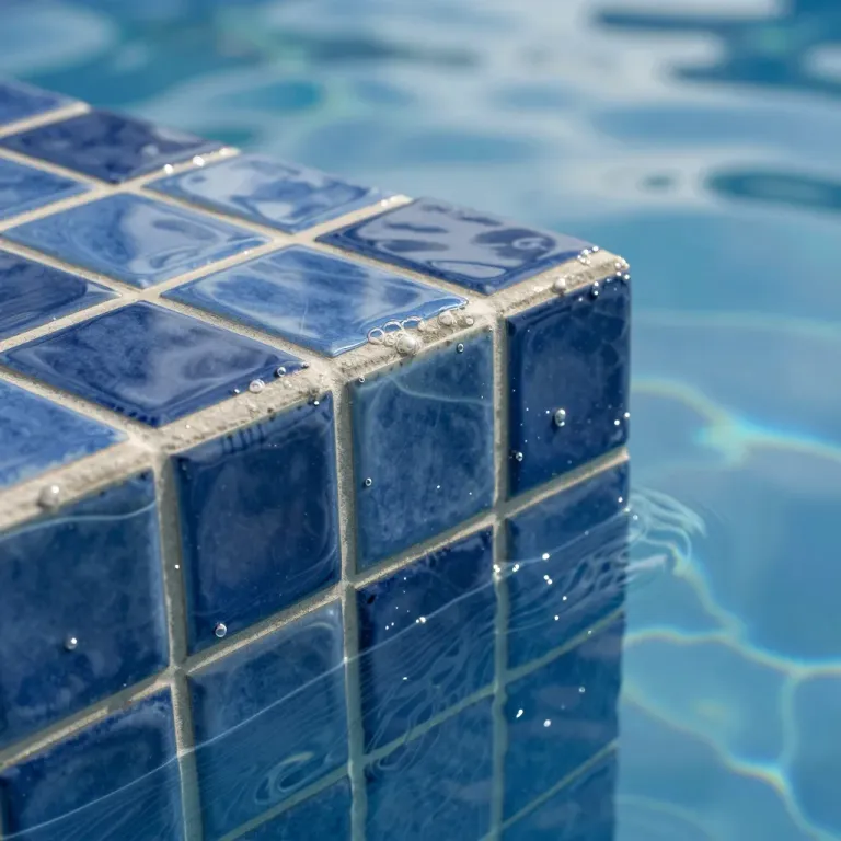 Glossy ceramic tiles with smooth grout lines reflect bright sunlight, creating a shimmering effect. The close-up shot emphasizes the texture and color variations, with a blurred water background adding depth.