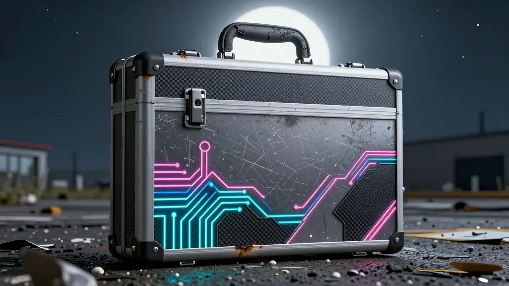 A metallic briefcase with glowing circuitry design stands in a cluttered industrial setting under neon light, casting sharp shadows. The composition emphasizes the briefcase, with debris in the foreground and a blurred background.