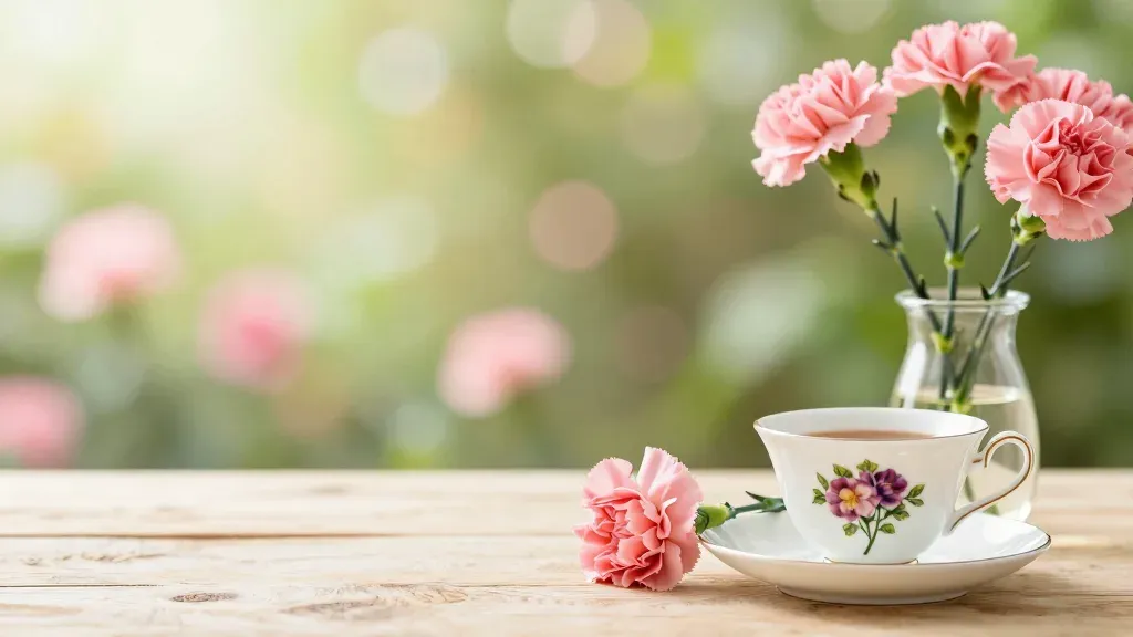 Porcelain teacups with floral patterns rest on a wooden table, surrounded by delicate pink carnations. Soft, diffused sunlight highlights the textures and creates a tranquil, natural setting.
