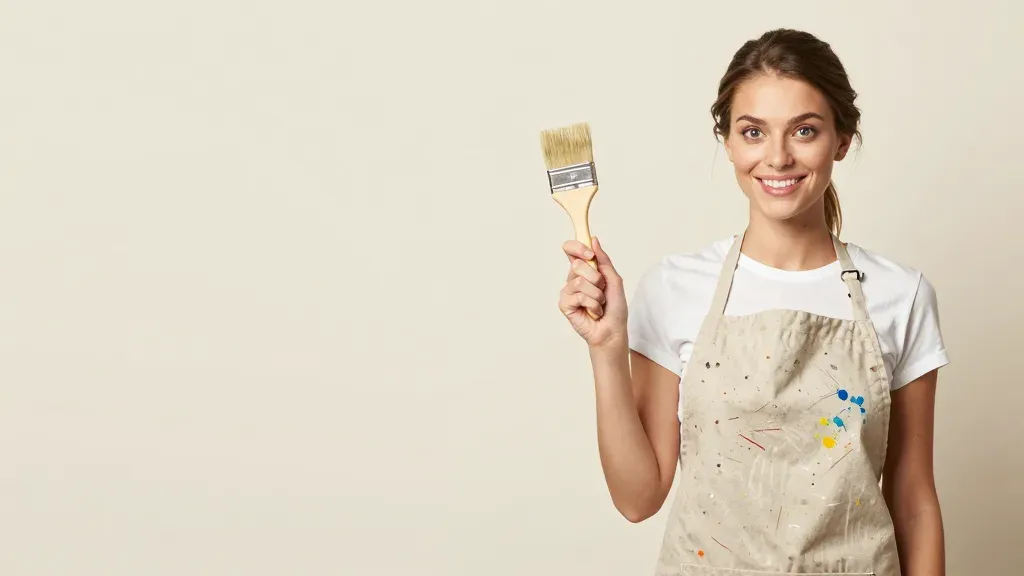 A young woman smiles while holding a paintbrush, wearing a paint-splattered apron over a white t-shirt, with dried blue, yellow, and red paint visible on the fabric. The image features soft front-lit studio lighting, a shallow depth of field, and ample negative space to the left on a plain off-white backdrop.