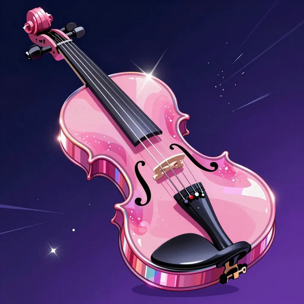 A crystal-clear violin with glossy pink varnished wood and reflective strings gleams under ethereal starlight, creating a dreamy, ethereal ambiance. The centered composition and soft lighting emphasize the violin as the focal point against a blurred starry night sky, offering ample copy space for design elements.