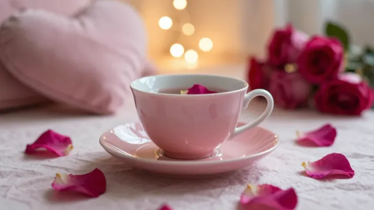 A close-up of a glossy pink teacup and saucer adorned with soft lace and velvety rose petals, bathed in warm, golden light that creates a soft, diffused glow. The shallow depth of field and blurred background with warm bokeh lights and out-of-focus rose petals emphasize the delicate textures and create a serene, romantic atmosphere.