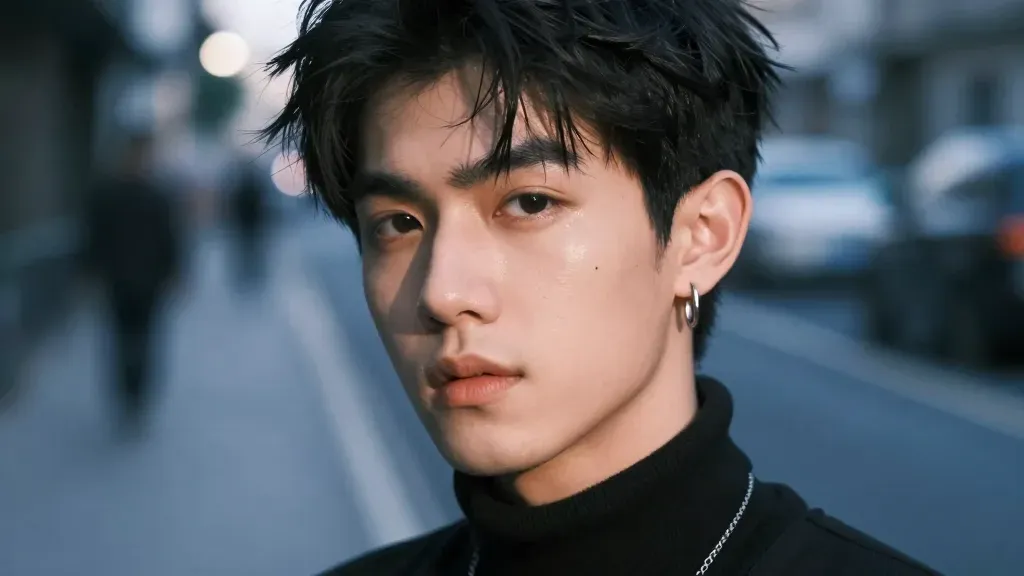 A person with tousled, glossy hair, wearing a black turtleneck and a thin chain necklace, stands against a soft, diffused light from the side, creating gentle shadows and highlights on their face and hair. The background is a blurred urban setting with cars and buildings, suggesting a city environment with a shallow depth of field.