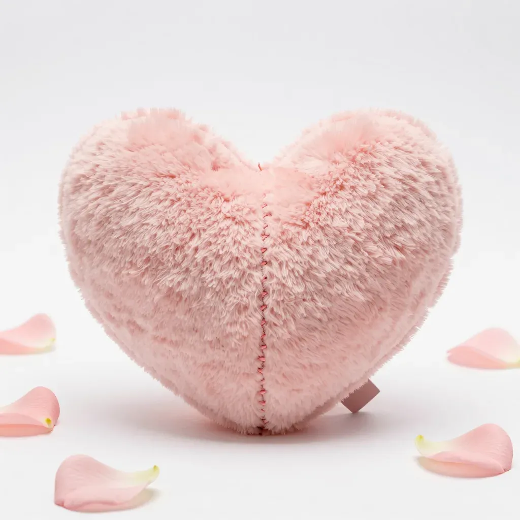 A soft, fluffy pink heart-shaped dog toy is centered, surrounded by pale pink rose petals, creating a romantic and cozy atmosphere. The diffused, warm lighting enhances the texture and depth of the toy, making it ideal for product photography and marketing materials.
