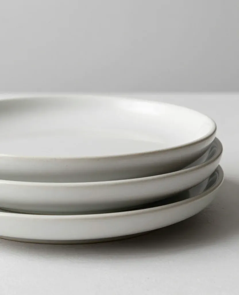 A close-up of neatly stacked ceramic plates with smooth, glossy porcelain surfaces and slightly rounded edges, softly lit to highlight their reflective surfaces against a blurred, neutral gray background.