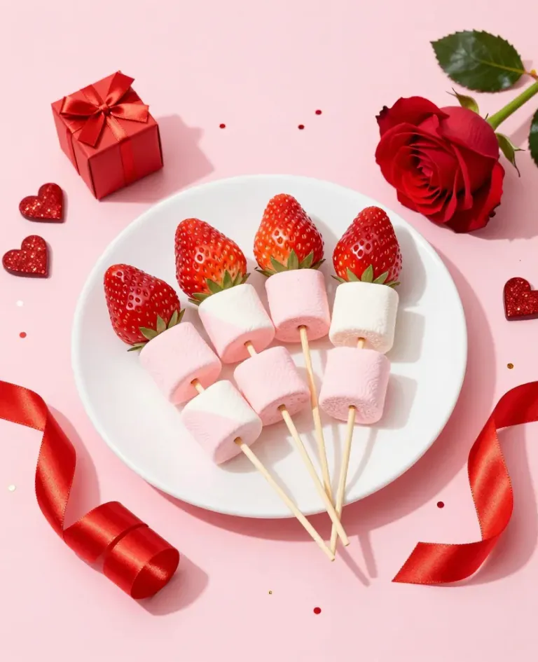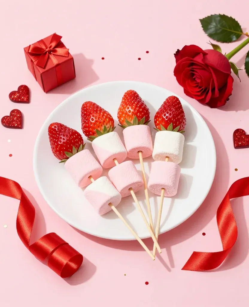 A circular arrangement of glossy strawberries and soft marshmallows on skewers, set against a warm, diffused light that highlights their textures and creates soft shadows, with a romantic pink background featuring a rose and red ribbon, adding a festive and elegant atmosphere.