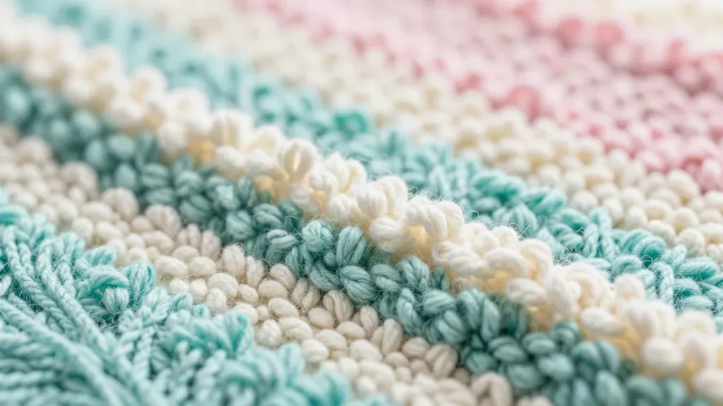 A close-up of a crocheted fabric with chenille yarn, showcasing its soft, bumpy texture and raised surface under soft, diffused lighting. The blurred background emphasizes the intricate details and tactile quality of the material.