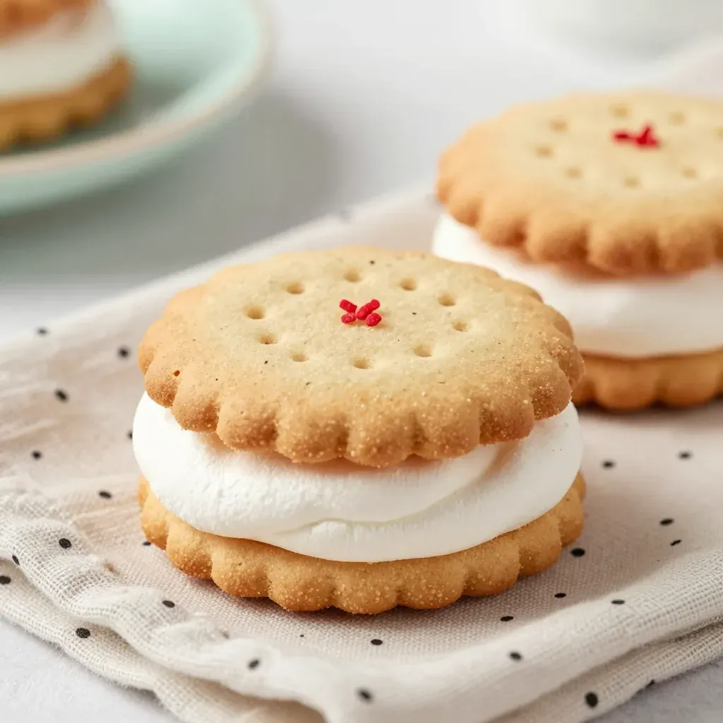 A close-up of golden marshmallow sandwiches with a soft, creamy filling, bathed in warm, ambient light that highlights the texture and color. The shallow depth of field and blurred background ensure the sandwiches are the focal point, making it ideal for culinary and food photography.