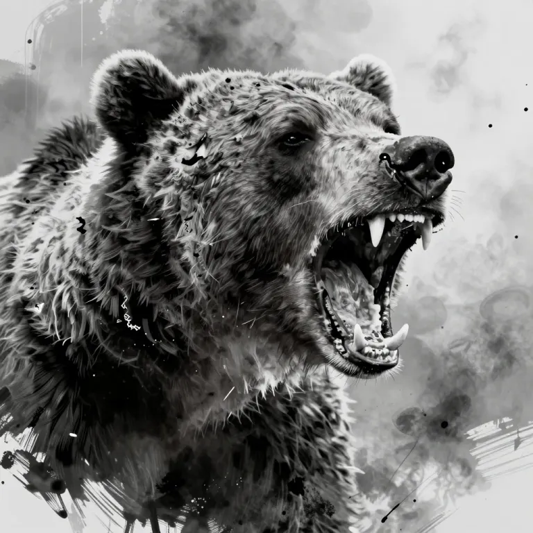 A grizzly bear mid-roar with mouth agape, fur rendered in layered ink washes and splatters, revealing sharp glossy teeth and weathered, scarred skin. Directional high-contrast lighting from the upper left creates deep shadows and highlights, while the abstract smoky background and shallow depth of field emphasize the subject’s ferocity and isolation.