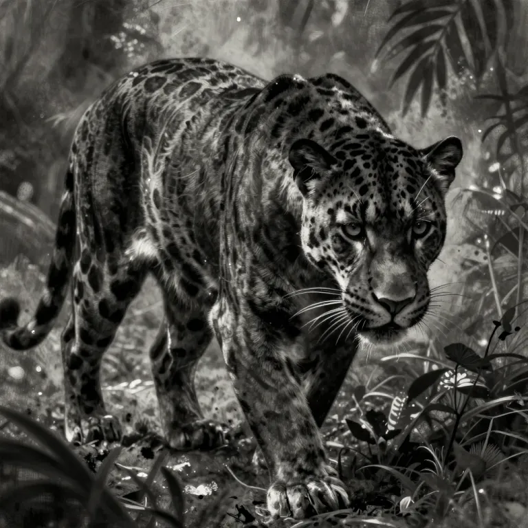 A crouched panther with a glossy, spotted fur coat and a focused expression, low to the ground, surrounded by dense jungle foliage. Soft, diffused light filters through the leaves, creating a dappled effect and highlighting the panther's features, with the foliage framing the scene and creating a sense of depth and enclosure.