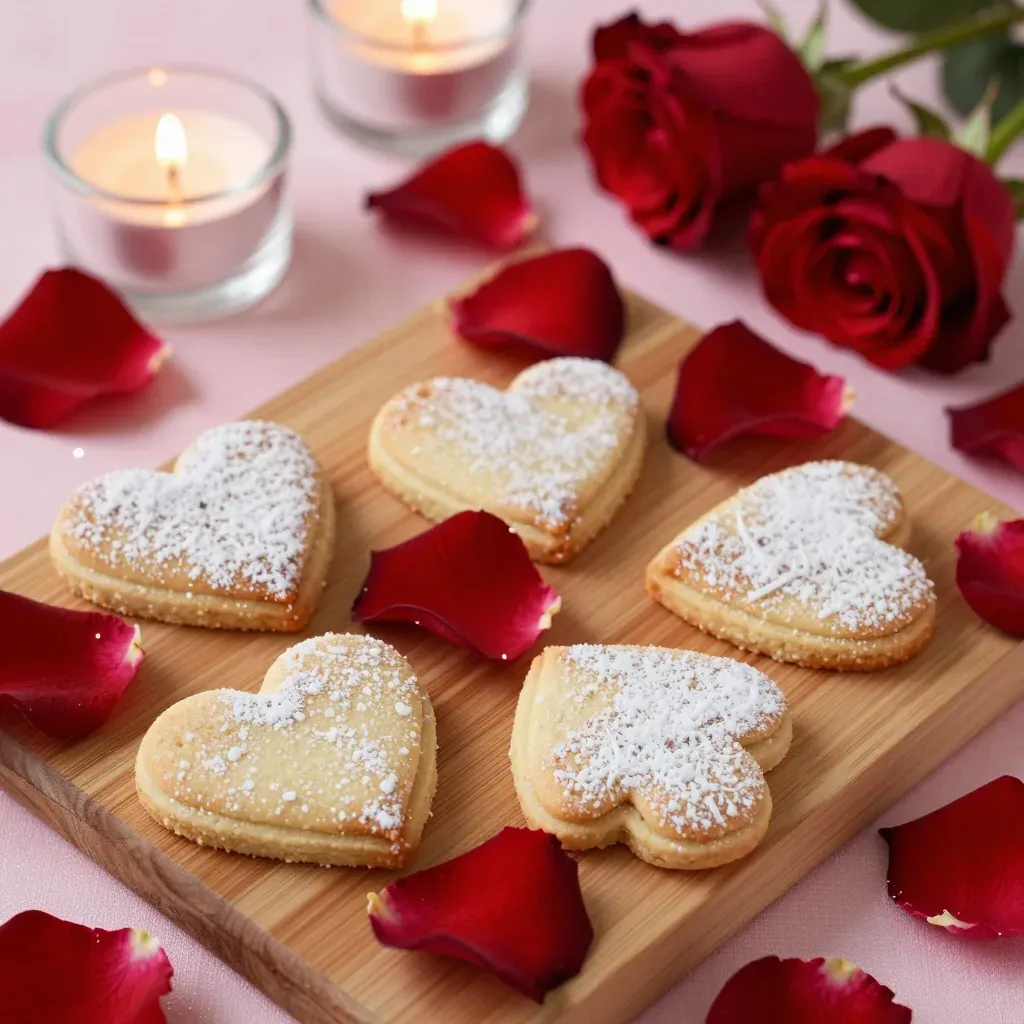Golden, flaky heart-shaped cookies dusted with powdered sugar are arranged on a wooden cutting board, surrounded by rose petals and flickering candles, creating a romantic and cozy atmosphere. The soft, warm lighting enhances the texture and color of the cookies, making the scene visually appealing and inviting.