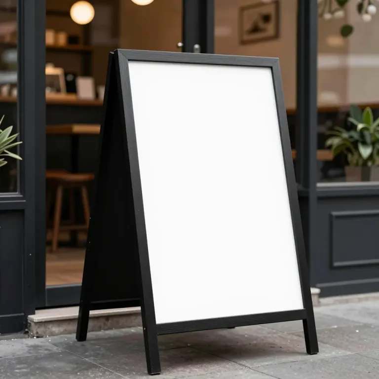 A smooth, glossy black chalkboard frame stands prominently in a cozy café, bathed in soft, ambient light that highlights its sturdy construction. The slight depth of field blurs the background, drawing attention to the frame's clean lines and inviting atmosphere.