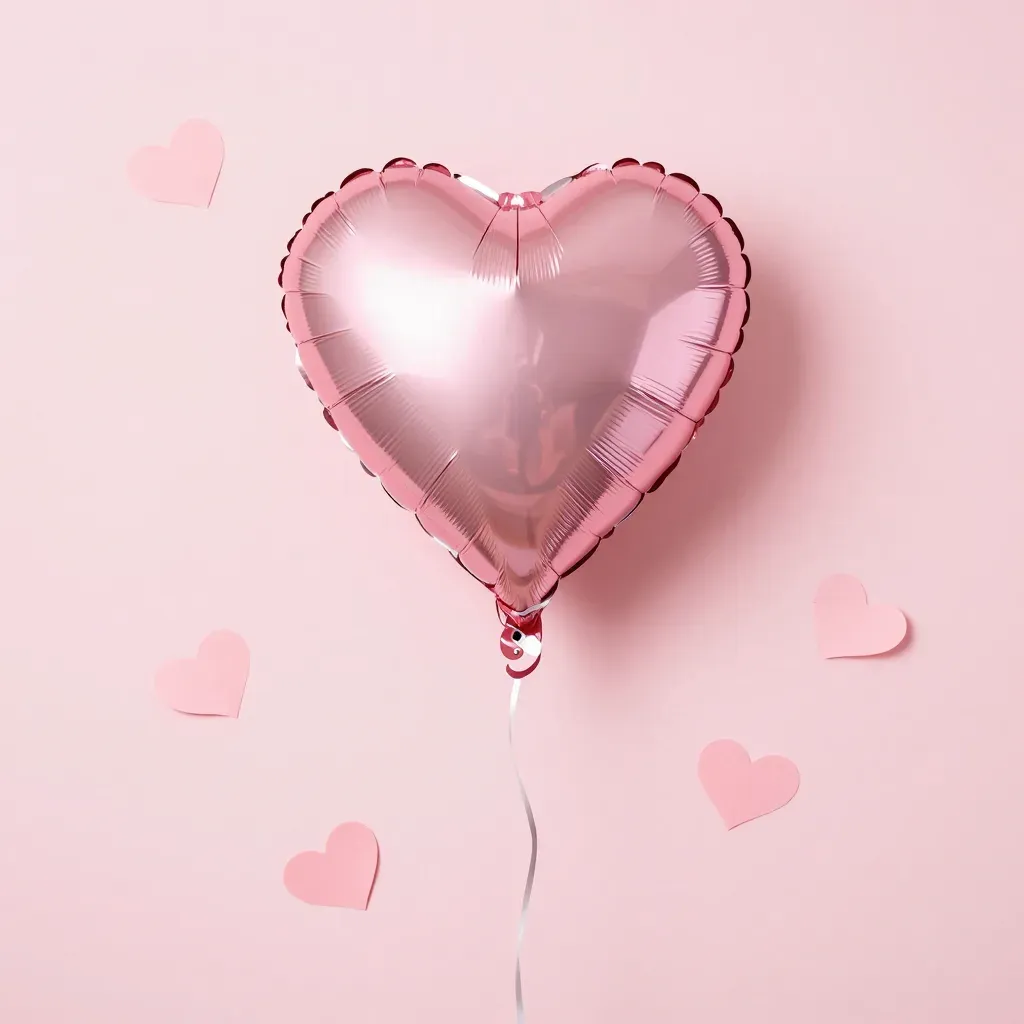 A rose gold heart-shaped balloon with a smooth, glossy surface is centered against a soft pink background, creating a romantic and playful atmosphere. The ambient, soft, diffused lighting highlights the balloon's edges, adding depth and dimension to the composition.