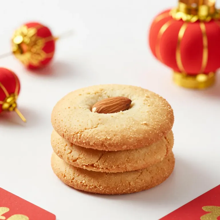 Golden-brown almond cookies stacked with glossy almonds, warmly lit to highlight texture and glossy almonds. Festive red and gold ornaments in the background create a shallow depth of field, emphasizing the cookies.