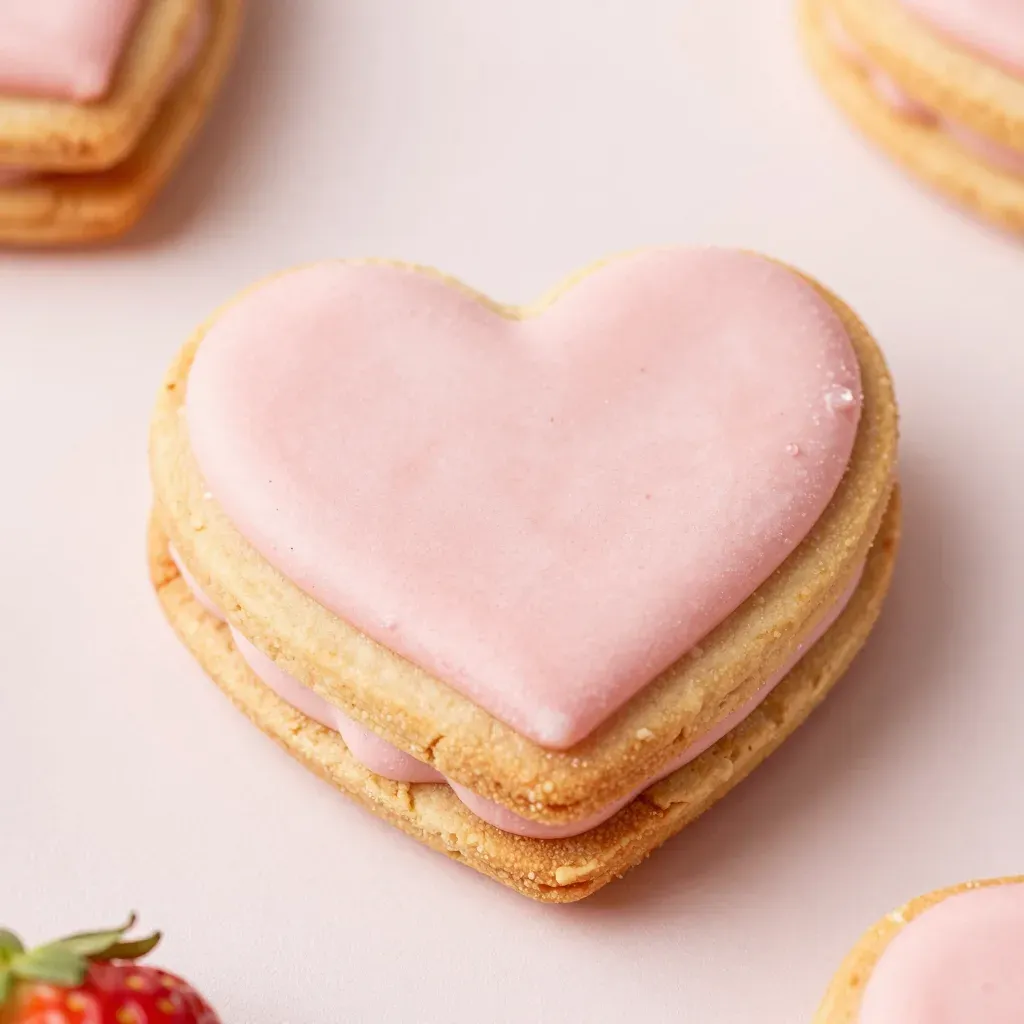 A close-up of a heart-shaped cookie sandwich with glossy pink icing, set against a soft, diffused light that highlights the smooth texture and creates subtle shadows, enhancing the clean and simple pastel pink background.