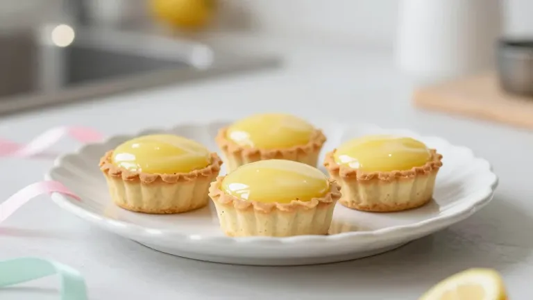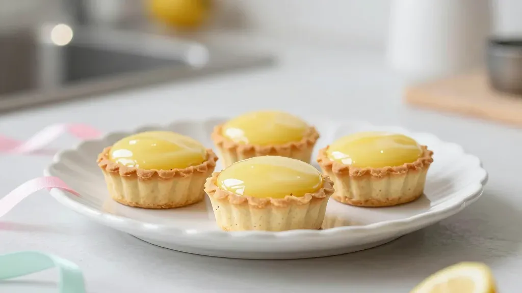 A circular arrangement of lemon curd tarts with glossy glaze on a white scalloped plate, softly lit to highlight the texture and color, creating a sense of abundance and inviting the viewer to partake. The blurred kitchen background provides context without distraction.