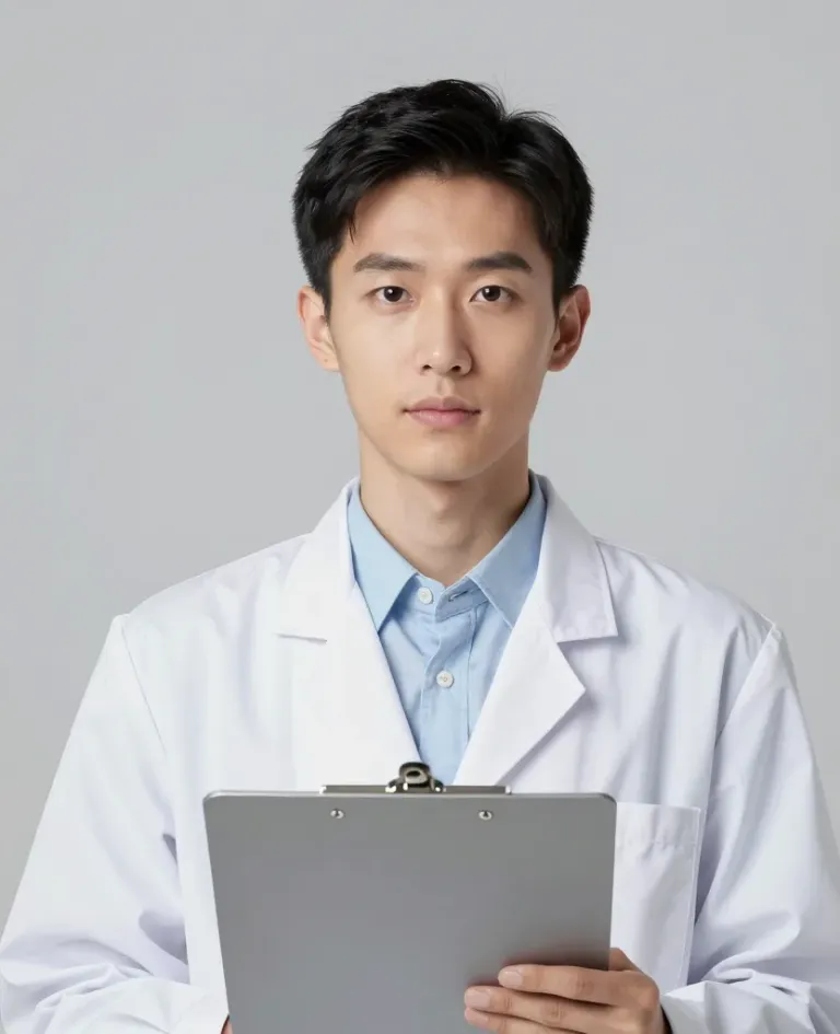A young individual in a white lab coat holds a glossy clipboard, illuminated by soft, diffused light. The neutral gray background ensures a clean and professional look, ideal for medical or scientific content.