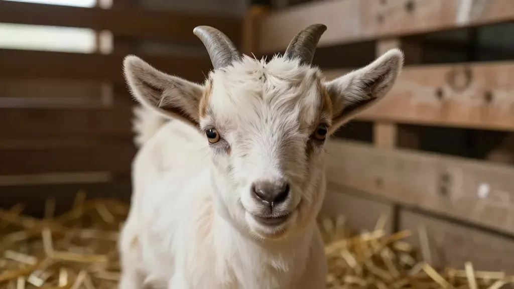 A young goat with a fluffy white coat and expressive eyes gently nudges forward, set against a rustic wooden pen with soft, natural light casting gentle shadows. The shallow depth of field draws attention to the goat's face, creating a serene and intimate portrait.