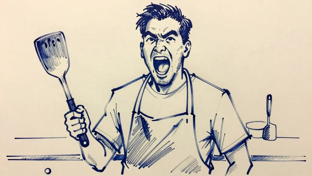 A man with a wild expression grips a worn spatula, his face detailed with fine lines and deep shadows, emphasizing his intensity. The strong directional lighting highlights his features and the texture of the spatula, while the simple kitchen counter and slightly out-of-focus utensils in the background draw attention to the subject.