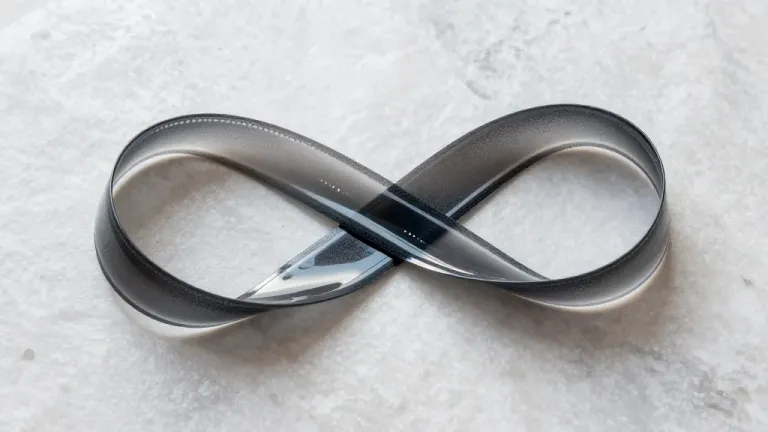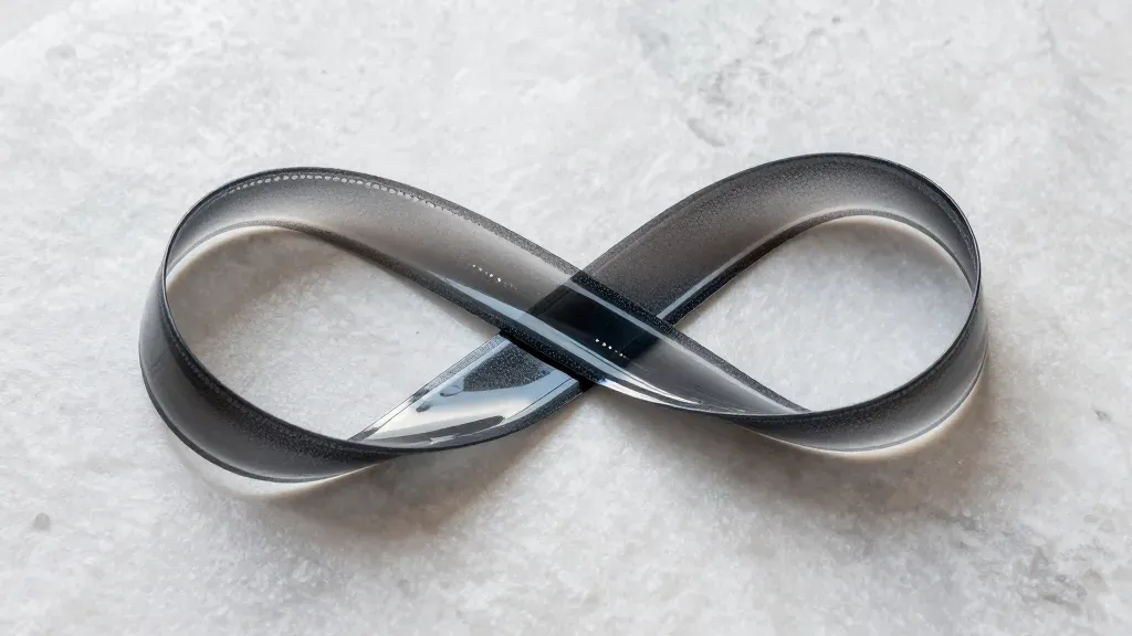 A close-up of a metallic ribbon-like object with a complex looped shape, showcasing its glossy, reflective surface and soft ridged texture under diffused lighting. The blurred, light-colored background contrasts with the object's metallic sheen, providing a clean and focused composition.