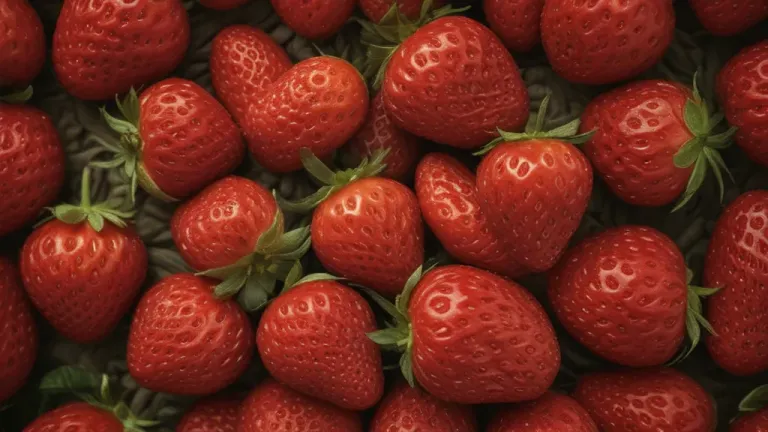 Close-up of glossy, dimpled strawberries in a rustic basket, softly lit to highlight their natural sheen, creating a sense of abundance and freshness. The dark, blurred background emphasizes the strawberries as the focal point.