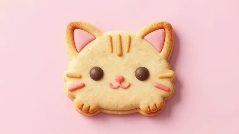 A golden-brown cat-shaped cookie with pink ears and whiskers, dusted with powdered sugar, is softly lit, highlighting its texture and giving it a warm, inviting glow. The solid pink background provides a clean and simple backdrop, making the cookie stand out and creating a sense of focus and immediacy.