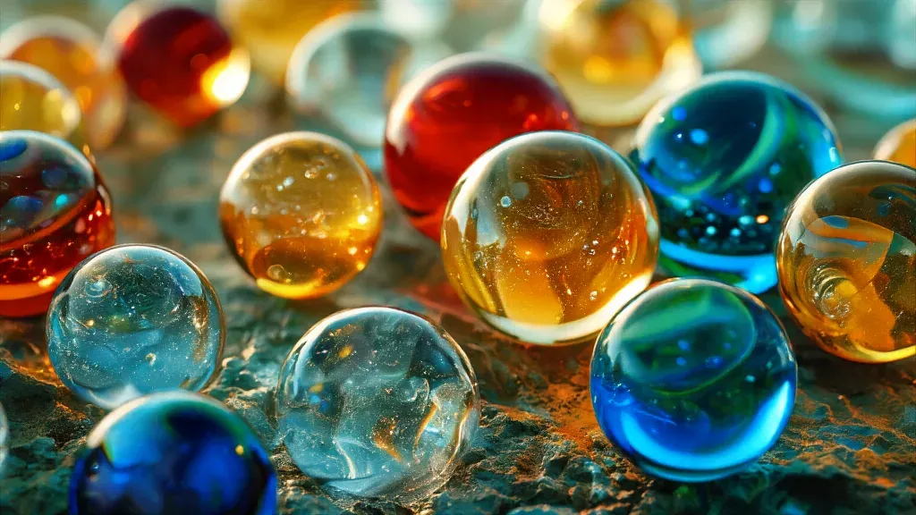 A close-up of vibrant glass marbles with a glossy finish, reflecting warm golden light, creating a shimmering effect. The blurred metallic stone background provides a cool contrast, enhancing the marbles' vivid colors and reflective surfaces.