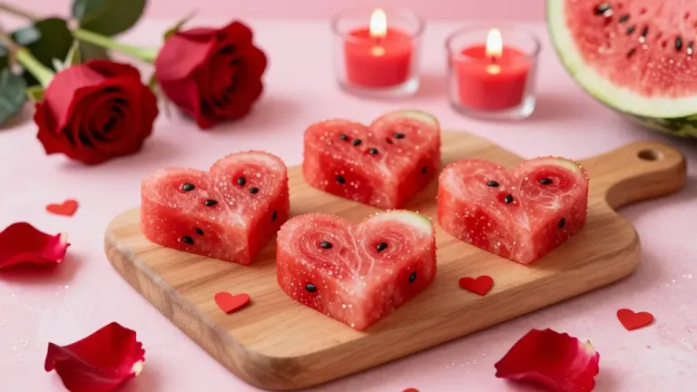 Glossy red watermelon slices arranged in heart shapes on a rustic wooden cutting board, softly lit to highlight texture and grain, creating a romantic and appetizing display with scattered rose petals and red candles in the blurred background.