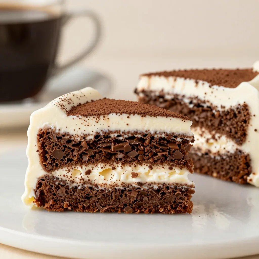 A close-up of a moist, dense chocolate cake slice with creamy frosting and cocoa powder dusting, softly lit to highlight its glossy surface and create gentle shadows. The blurred background of a coffee cup and white surface suggests a cozy setting.