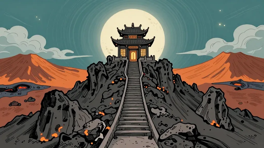 A serene temple stands on a rugged volcanic ridge under a full moon, with glowing lava and distant mountains in the background. The soft lantern light and ethereal moonlight create a tranquil and mystical atmosphere, ideal for a calm, reflective design.
