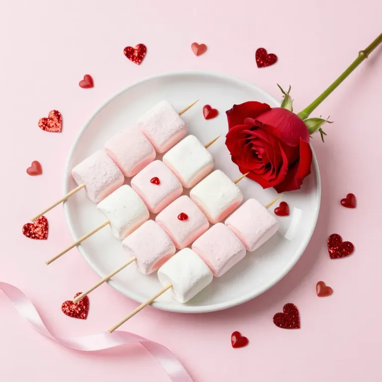 Soft, fluffy marshmallows on skewers are arranged in a neat grid, accompanied by a velvety red rose, creating a romantic and festive scene. The diffused, soft light highlights the textures of the marshmallows and rose, while the scattered red heart confetti and subtle pink ribbon add a playful and elegant touch.