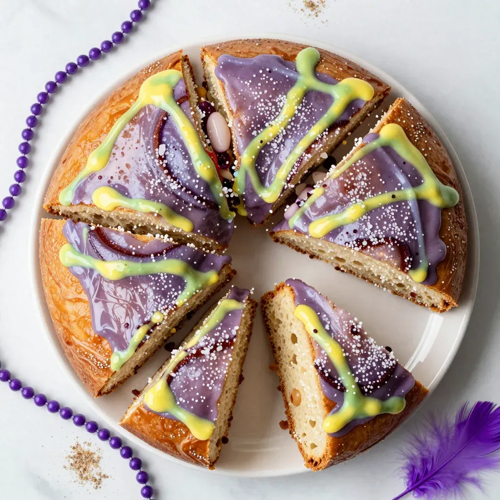 Golden-brown king cake slices are artfully arranged on a white plate, showcasing glossy purple icing and crunchy white sugar under soft, diffused lighting. The clean white background and string of purple beads enhance the festive presentation, ideal for culinary and food photography.
