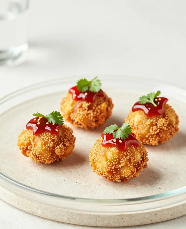 Four golden-brown fried croquettes with crispy breading are topped with glossy red sauce and fresh cilantro, arranged on a white plate. Soft overhead lighting creates subtle highlights and gentle shadows, with a shallow depth of field emphasizing the foreground and a minimalist background providing clean copy space.