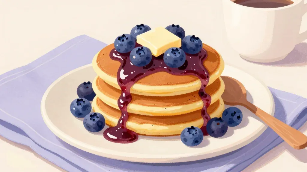 A stack of golden pancakes topped with plump blueberries and glossy syrup, bathed in soft, diffused light that highlights the textures and colors, creating a visually appealing and appetizing scene. The simple background and centered composition ensure the focus remains on the delectable breakfast dish.